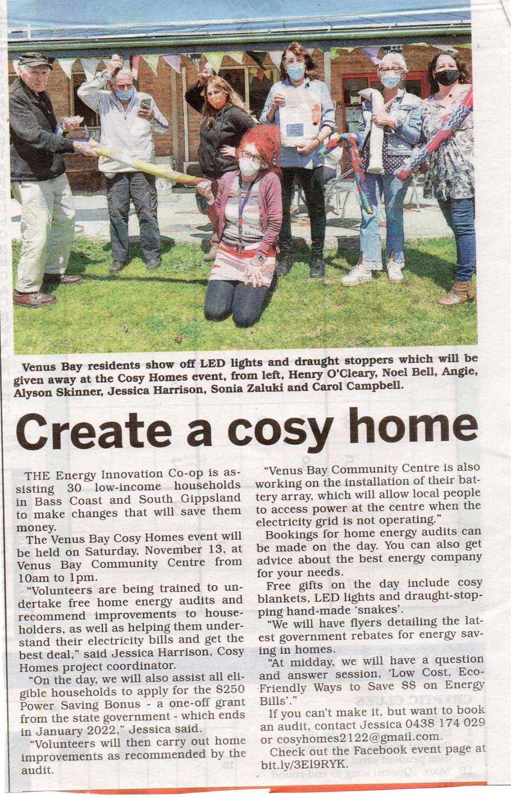 “The Cosy Homes one day event at the Bass Coast Adult Learning Centre was a great success. With the help of the Energy Innovation Co-operative, Cosy Homes applied for a grant for $28,045 through the Department of Environment, Land, Water and Planning, known as DELWP. They were successful as part of the Victorian Government's Regional Climate Change Adaptation Strategy 2021 to 2022. This meant that they were able to expand the Cosy Homes Project and support 30 homes across the Bass Coast Shire and South Gippsland Shire to become more energy-efficient and cosy.”