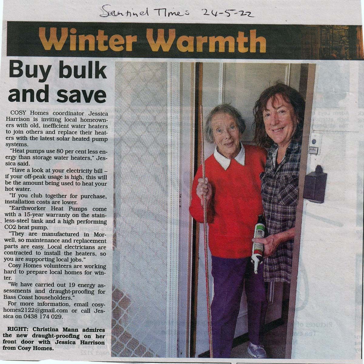 “Jessica Harrison and Aileen Vening are the founders of Cosy Homes. Cosy Homes is a community project to support householders with simple ways to make their homes more energy-efficient, comfortable and cosy, as well as reducing their energy costs. Jessica and Aileen are both passionate about climate action and have been involved in many environmental groups over the years including the Bass Coast Climate Action Network.”