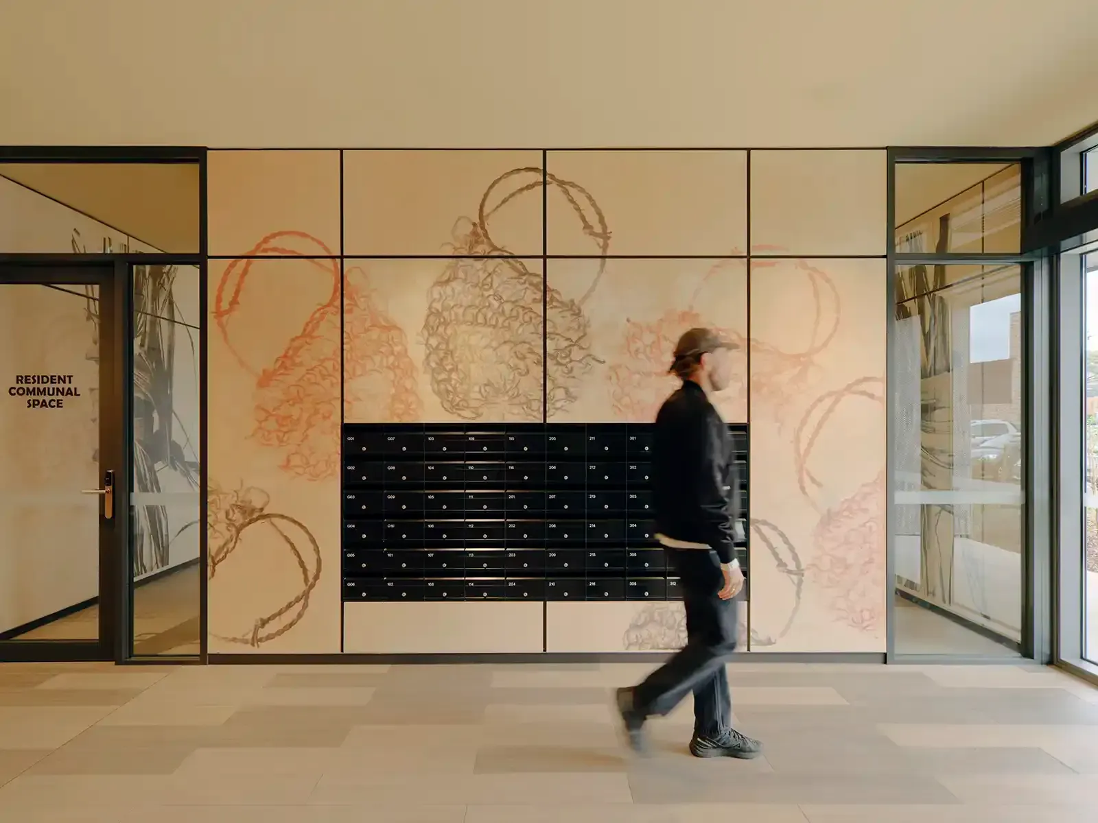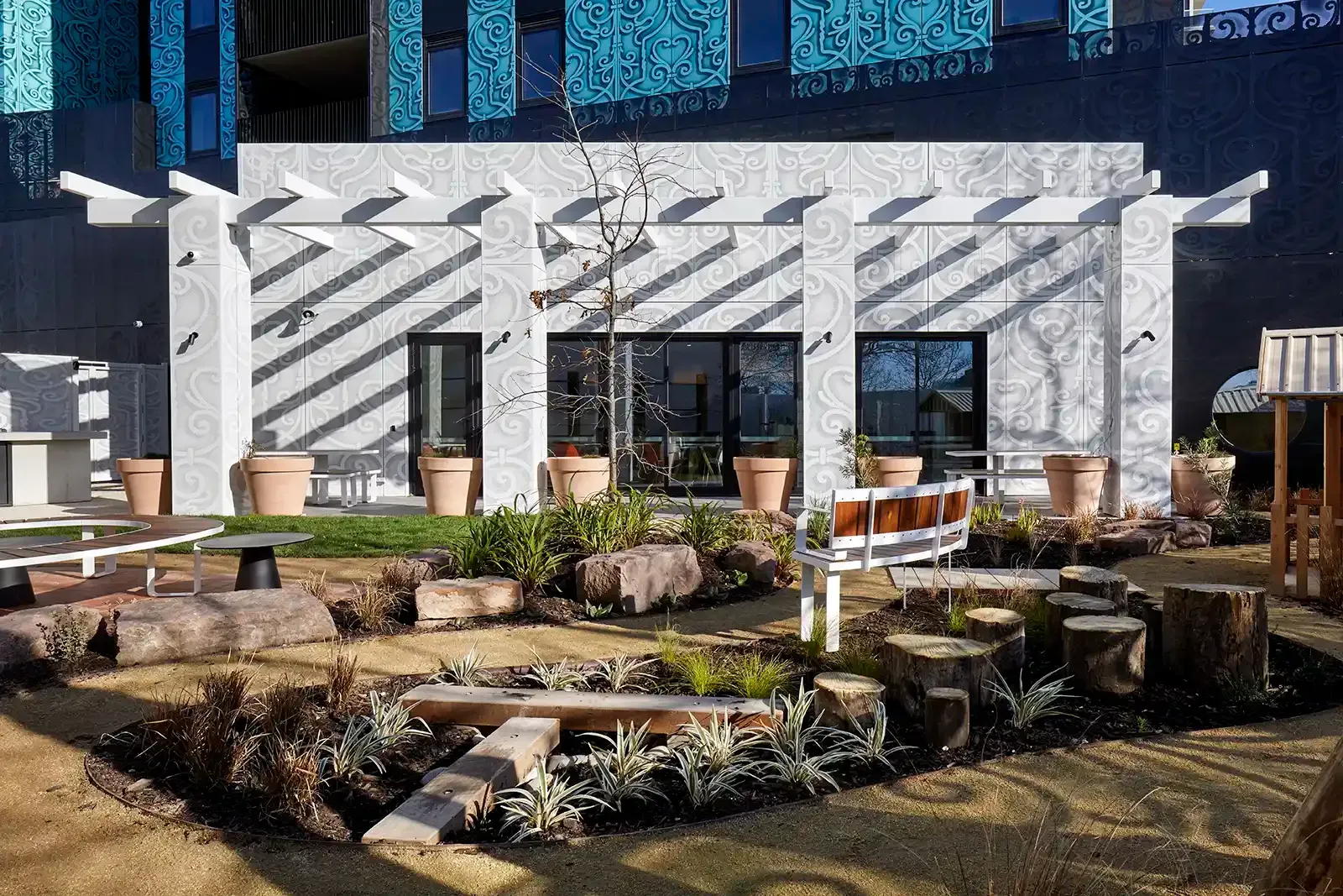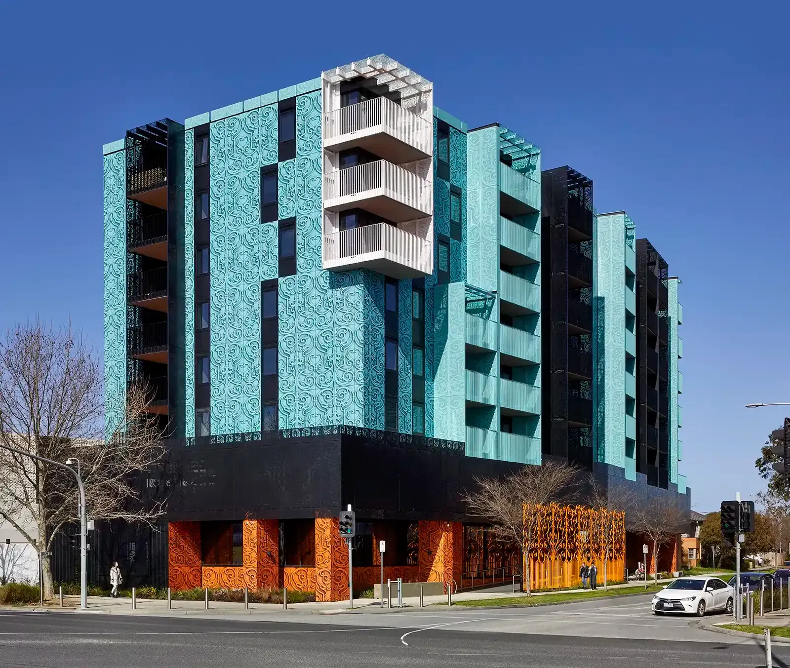 Site-specific artworks are integrated into the communal spaces, including work from First Nations artist Cassie Fisher-Patterson symbolising the tying together of the five Kulin Nation clans.